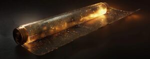 An artistic representation of a digital scroll unrolling with lines of glowing code, signifying the ancient roots and futuristic application of contracts